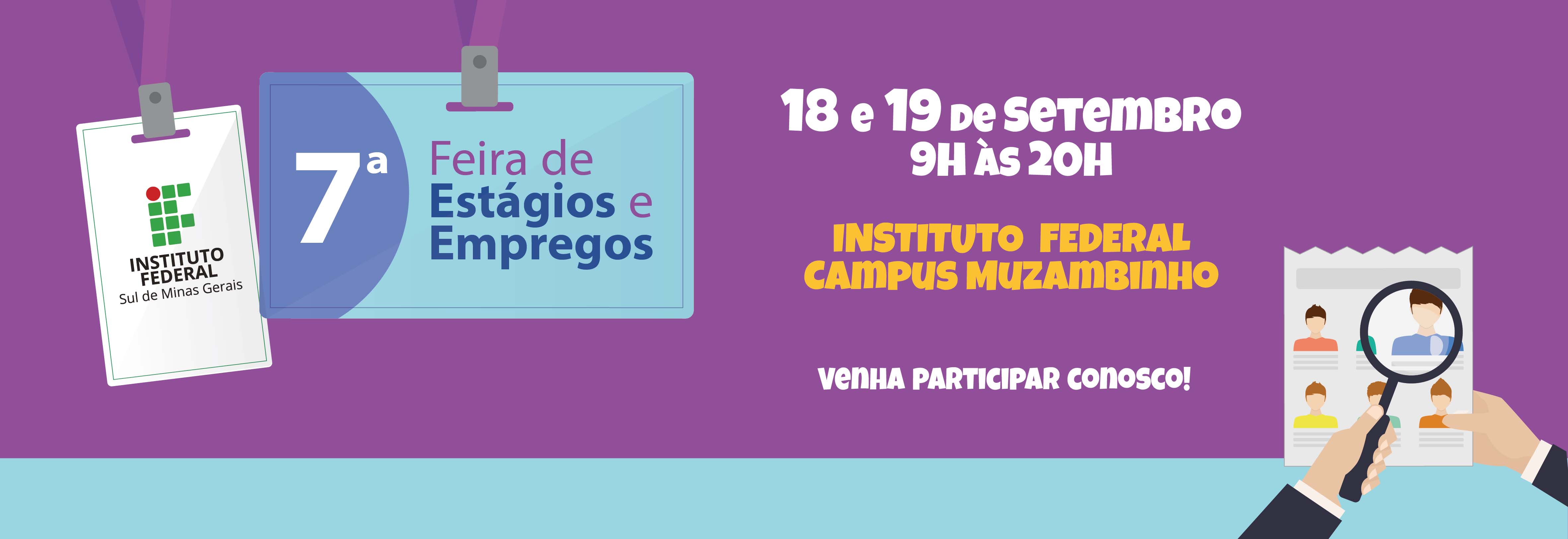 O Instituto Federal do Sul de Minas (IFSULDEMINAS) promoverá nos próximos dias 18 e 19 de setembro a 7ª edição da Feira de Estágios e Empregos, com a participação de 52 empresas dos ramos agropecuário, farmacêutico, alimentício, educacional, administrativo, automotivo, industrial, entre outros. A Feira é aberta ao público e sua entrada é gratuita.