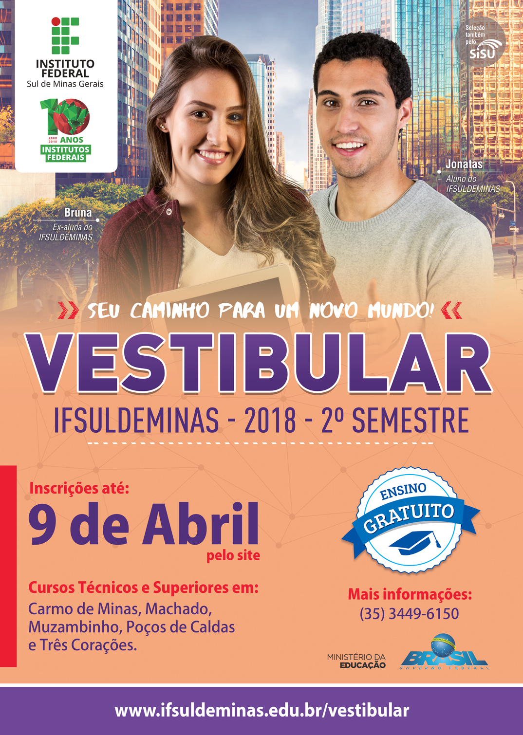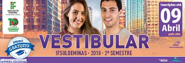 O Instituto Federal do Sul de Minas (IFSULDEMINAS) está com inscrições abertas para o Vestibular do 2º semestre de 2018.
