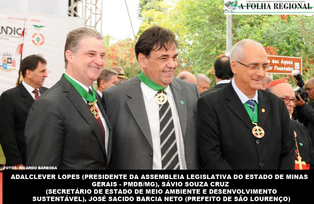 No Dia Mundial da Água, deputado Adalclever Lopes é homenageado em solenidade no Sul de Minas. O presidente da Assembleia Legislativa de Minas Gerais (ALMG), deputado Adalclever Lopes (PMDB), foi agraciado, no domingo (22/3/15), com a Comenda Ambiental Estância Hidromineral de São Lourenço. Os deputados Carlos Henrique (PRB), João Alberto (PMDB) e Arnaldo Silva (PR) também receberam a honraria, cuja cerimônia de entrega foi realizada no Parque das Águas, em São Lourenço (Sul de Minas). Esta foi a 5ª edição da homenagem, que, neste ano, destacou 123 personalidades que contribuem para o desenvolvimento e a conservação do meio ambiente e do turismo.