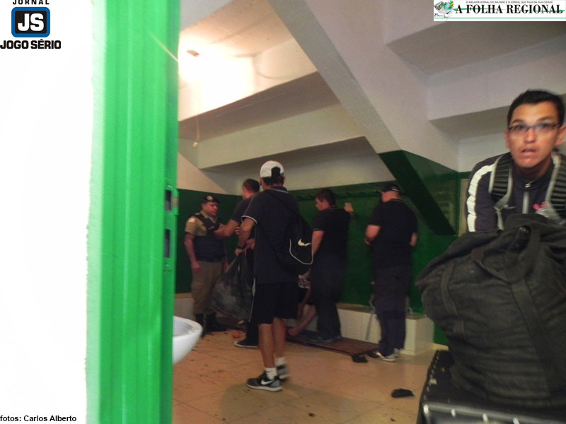 O tenente da PM, Márcio, conversa com o atleta no vestiário; militar liderou a situação, tendo identificado o autor e o conduzido ao Quartel