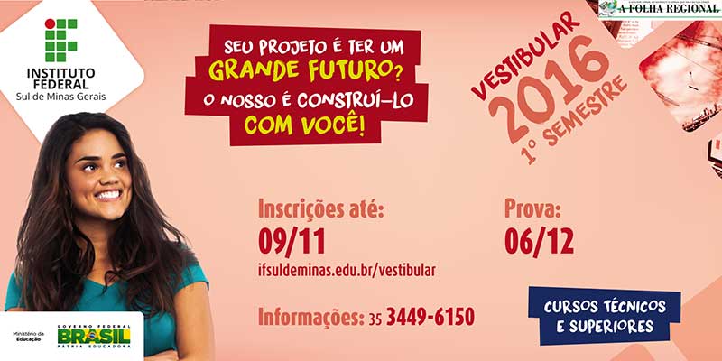 A instituição oferta mais de 3100 vagas em cursos técnico se superiores. A partir desta segunda-feira, 5 de outubro, o Instituto Federal do Sul de Minas - IFSULDEMINAS estará com as inscrições abertas para o Vestibular 2016/1º semestre.