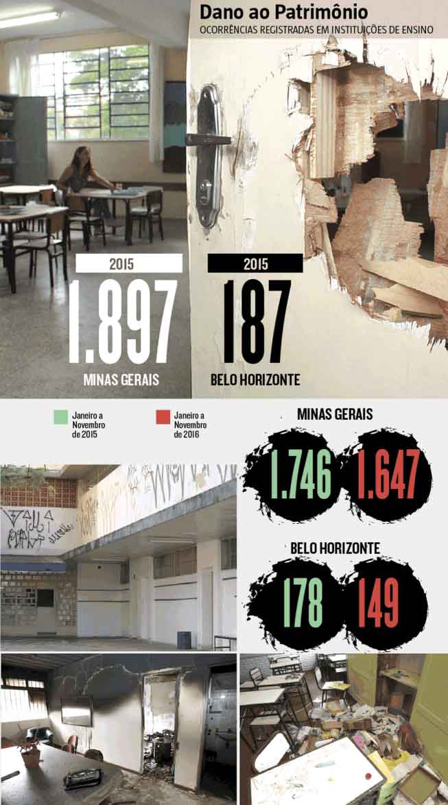 De janeiro a novembro de 2016, 1.647 ocorrências de dano ao patrimônio foram registradas em escolas estaduais, média de cinco por dia. Em Belo Horizonte, foram 149 casos no mesmo período, de acordo com a Secretaria de Estado de Segurança Pública. Não é possível precisar em quantos deles houve envolvimento de alunos das próprias instituições.