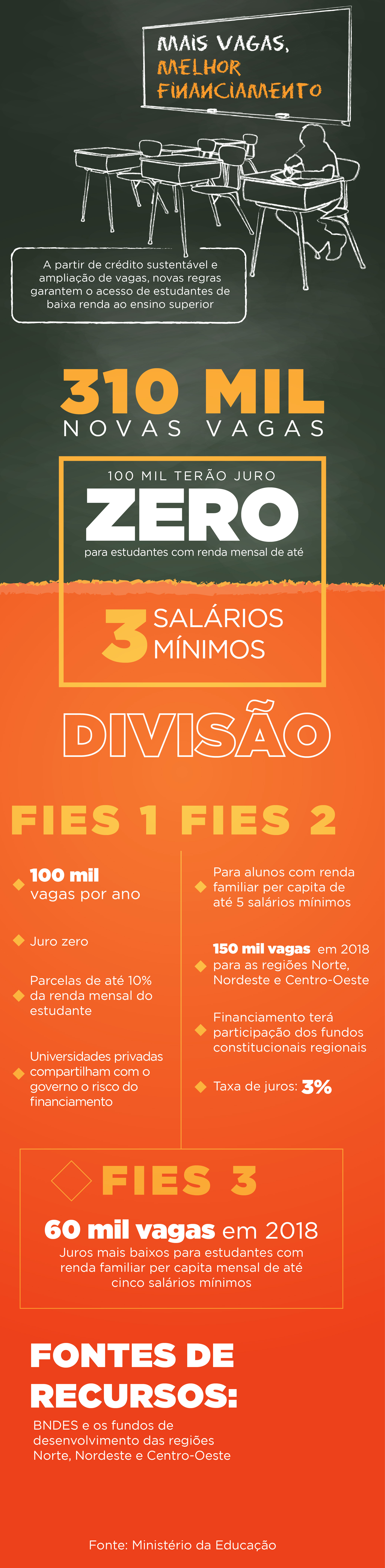 Três modalidades, com taxas de juros especiais, passam a compor o programa do Ministério da Educação (MEC), a partir de 2018. O Fies 1, com financiamentos a juro zero, vai oferecer 100 mil vagas por ano para estudantes com renda per capita mensal familiar de até três salários mínimos. As prestações serão parcelas de no máximo 10% da renda mensal futura do aluno.
