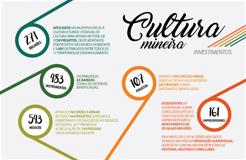 O último edital da Lei Estadual de Incentivo à Cultura, por exemplo, concedeu R$ 92,3 milhões em incentivos, o maior valor já registrado em toda a história da lei. E mais que isso: para assegurar a democratização da cultura no interior, 45% da verba total foi destinada a projetos de proponentes de fora da capital mineira.