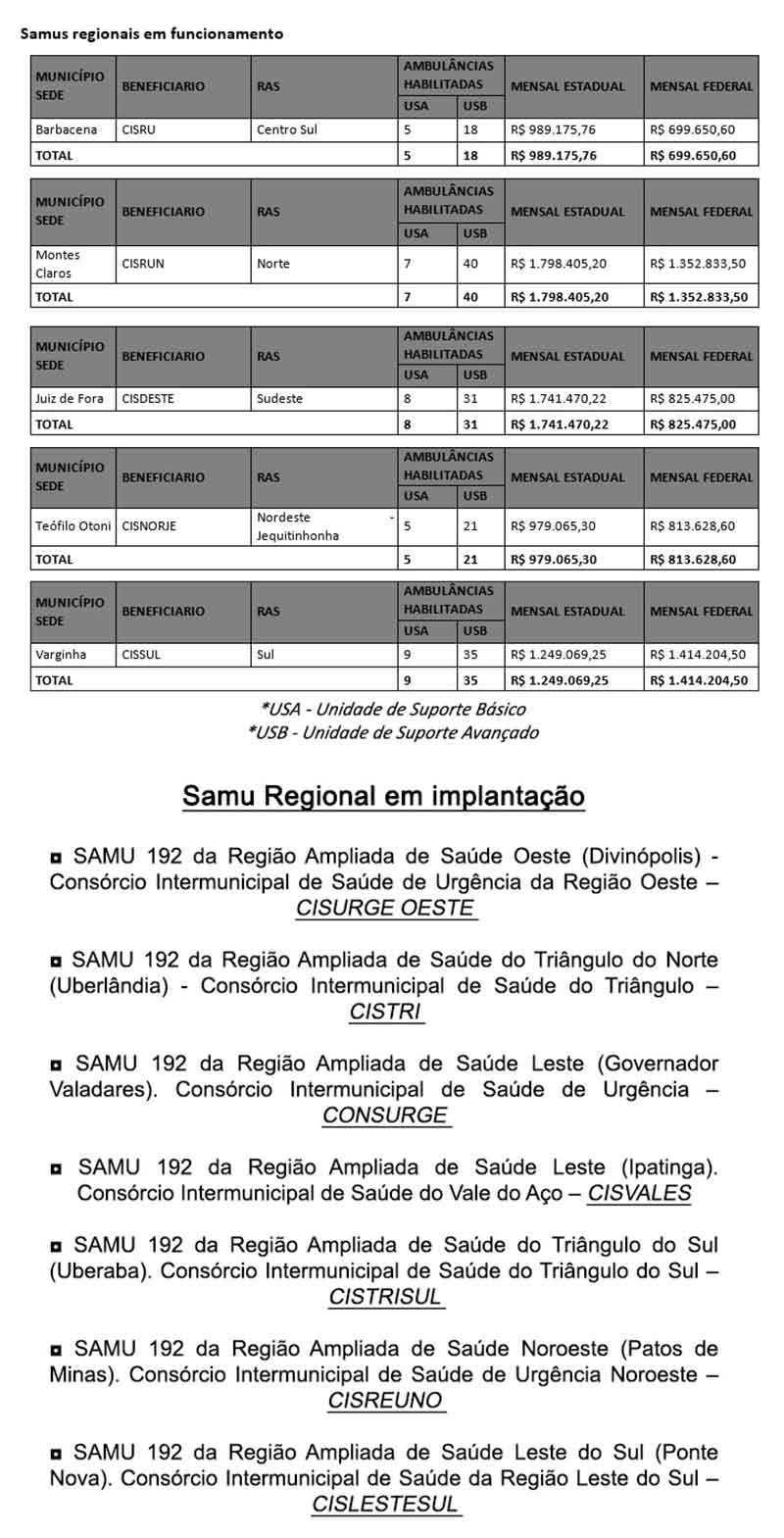 De fevereiro de 2015 a dezembro de 2016, a SES-MG destinou, mensalmente, ao Consórcio Intermunicipal de Saúde da Macro Região do Sul de Minas, que gerencia o serviço de atendimento móvel de urgência e emergência Samu/192 na região, R$ 2.663.273,75 milhões para custeio, ficando responsável pela parte do Ministério da Saúde, já que o Samu ainda não era credenciando pelo ministério.