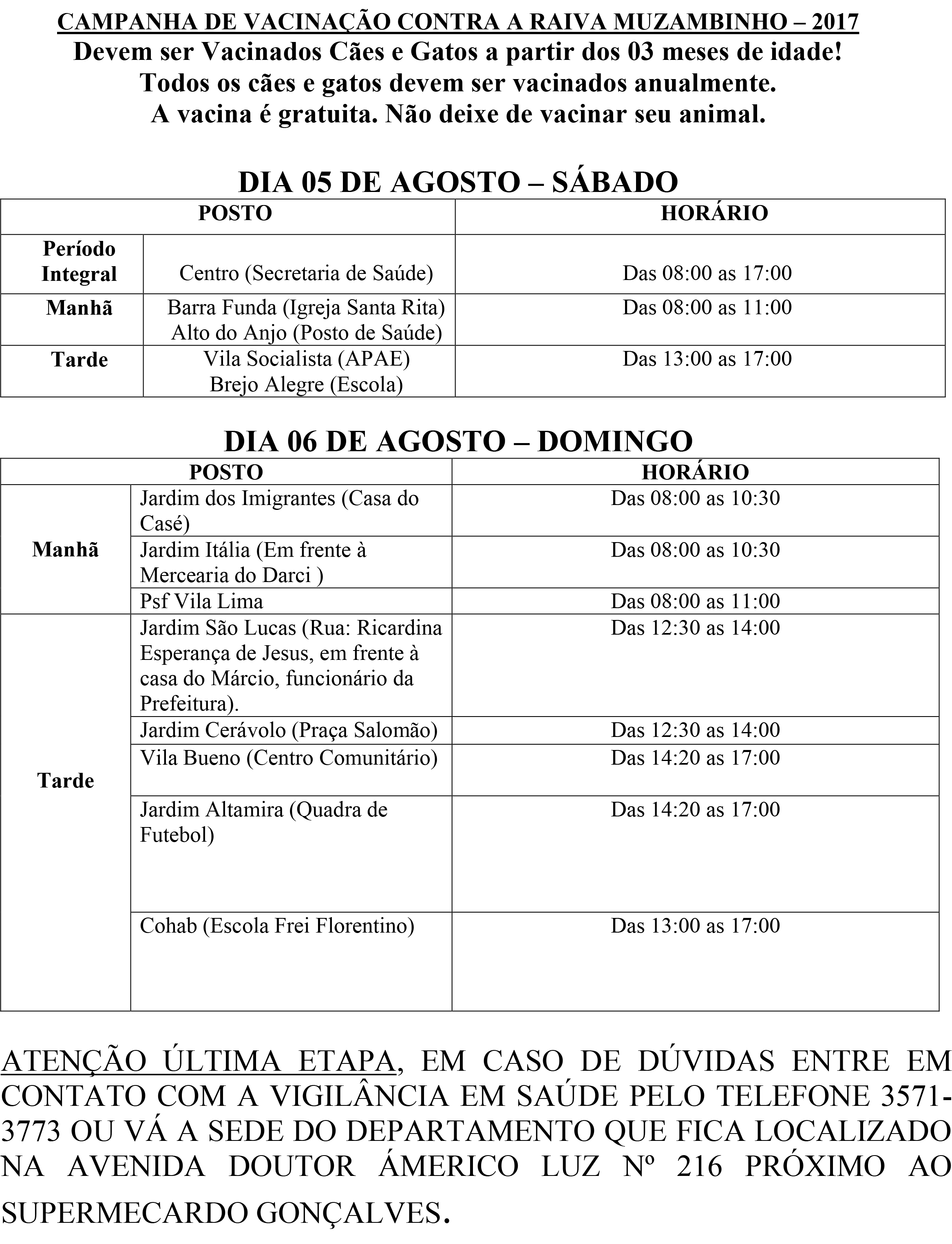 A Prefeitura de Muzambinho, por meio do Departamento de Vigilância em Saúde, vem informar a toda população, sobre a ÚLTIMA ETAPA da Campanha de Vacinação Antirrábica em cães e gatos 2017; que acontecerá na área urbana em diferentes locais, nos dias 05 e 06 de Agosto, Sábado e Domingo.