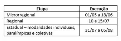 A última fase da competição, a estadual, acontece de 31 de julho a 05 de agosto com modalidades individuais, coletivas e paralímpicas.