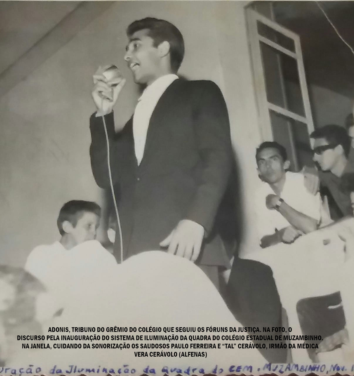 Repetindo, conforme o parágrafo anterior, que, sem que a TV tivesse chegado a Muzambinho, era o cinema nossa grande fonte de lazer e de cultura. Mas, era pago, nem todos podiam frequentá-lo quase todos os dias. Então, havia outro grande espaço de diversão que era a Quadra de Esportes do Colégio, no coração da Avenida Américo Luz, a mesma que ainda hoje sobrevive. Ali, não se praticava só a Educação Física da grade escolar, mas, eventos culturais ou esportivos, tipo o futsal, o handebol, o voleibol e até o basquetebol. Pois bem, desde 1962, Adônis Galileu dos Santos tinha sido eleito e reeleito, em eleições colegiais amplas e secretas, para o cargo de Orador do Grêmio SALCEM – Social, Artístico e Literário do Colégio Estadual de Muzambinho. Em meados do ano seguinte, o da nossa despedida como alunos do Colégio, fomos eleitos para um mandato que não se completaria, sob contrariedade do então Diretor, Prof. Reinaldo Benassi, justamente, porque iríamos concluir nossos cursos em definitivo no fim do ano. Comigo na Presidência do Grêmio, com outros companheiros, mas, sobretudo com o entusiasmo e o assíduo trabalho de Adônis junto à comunidade muzambinhense, construímos uma obra que o Estado de Minas Gerais foi incapaz de fazê-la: dotar a Quadra do Estadual com moderna iluminação, que fizesse jus à importância que ela então representava para o ensino, o esporte, à cultura e o lazer de Muzambinho. Com apoio da Prefeitura, de contribuições de cidadãos e do comércio local e de arrecadações com jogos e festas, concretizamos o nosso intento, inaugurando esse feito em novembro de 1963. Segundo o escritor Amir Álem Aquino, no seu livro Personalidades, Histórias de Vidas, Editora Legis Summa, 2010, pgs. 136/37 “A iluminação, ou melhor, a ‘escuridão’ anterior foi jogada ao chão; nem mesmo os postes antigos (de canos de ferro) foram utilizados. Tudo novo em folha. (((com a permissão do Amir vou fazer um adendo: com postes de cimento construídos pelos alunos e colocados em moldes de madeira no antigo almoxarifado da Prefeitura, onde hoje funciona o Supermercado São João, ex-Lojas Irmãos Santini de Materiais de Construção. Durante alguns dias, a fim de não trincarem, eles teriam que ser regados com água de manhã e à tardinha, quase sempre missão para Adônis e Marco Regis))).  E, assim, em aproximadamente cinco meses, a quadra passou a ter uma iluminação decente. Esta iluminação durou quase trinta anos, até o dia em que a quadra foi coberta e teve de ser substituída por outra que se adequasse ao formato da sua cobertura”.
