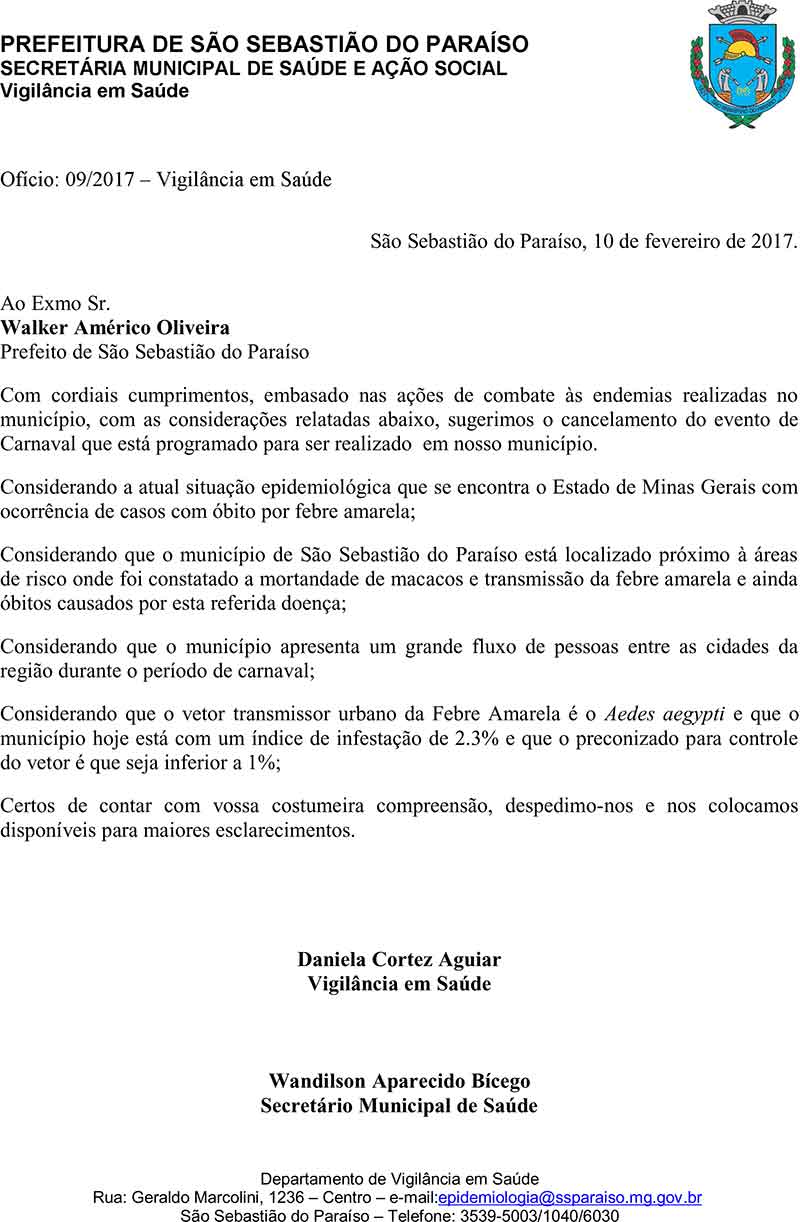 Ainda de acordo com as justificativas apresentadas, o município apresenta grande fluxo de pessoas entre as cidades da região durante o período de carnaval. "Considerando que o vetor transmissor urbano da Febre Amarela é o Aedes aegypti e que o município hoje está com um índice de infestação de 2,3% e que o preconizado para controle do vetor é que seja inferior a 1%, a representante da Vigilância em Saúde, junto com o secretário municipal de Saúde, Wandilson Bícego, sugerem o cancelamento do evento de Carnaval que está programado para ser realizado no município”. A solicitação foi acatada pelo prefeito Walkinho.