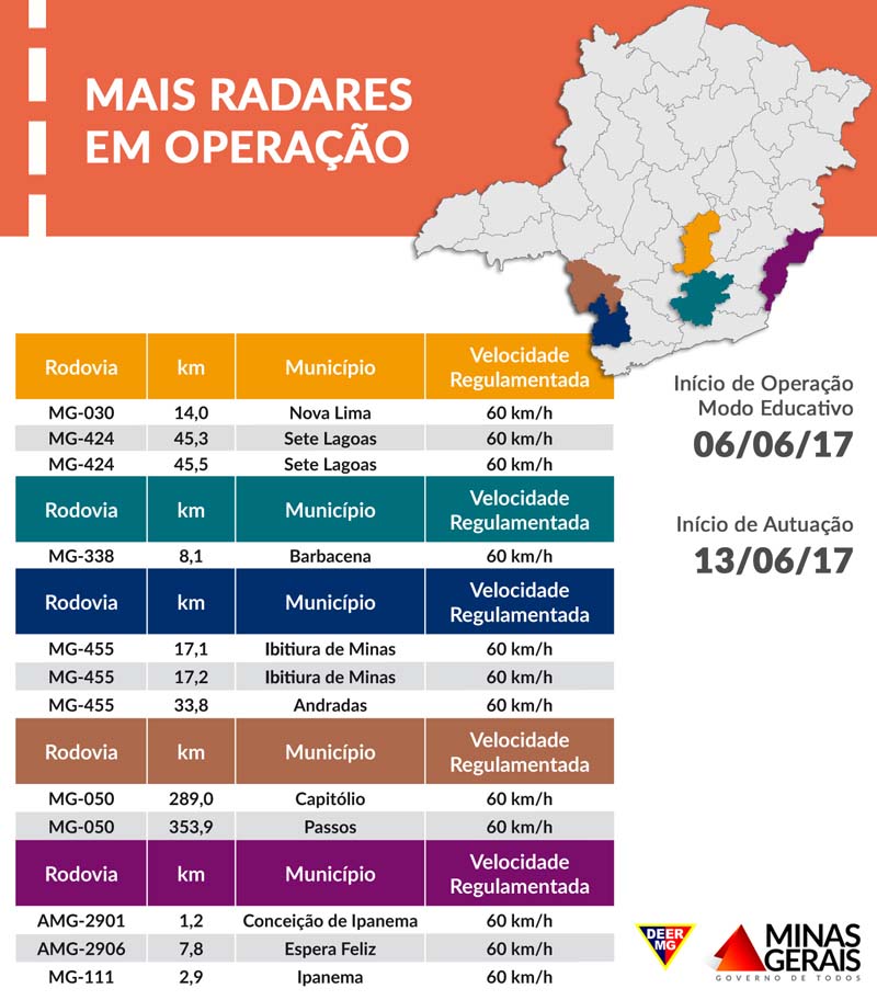 Equipamentos de controle eletrônico de velocidade foram instalados, com velocidade máxima permitida estabelecida, para os trechos, de 60 km/h