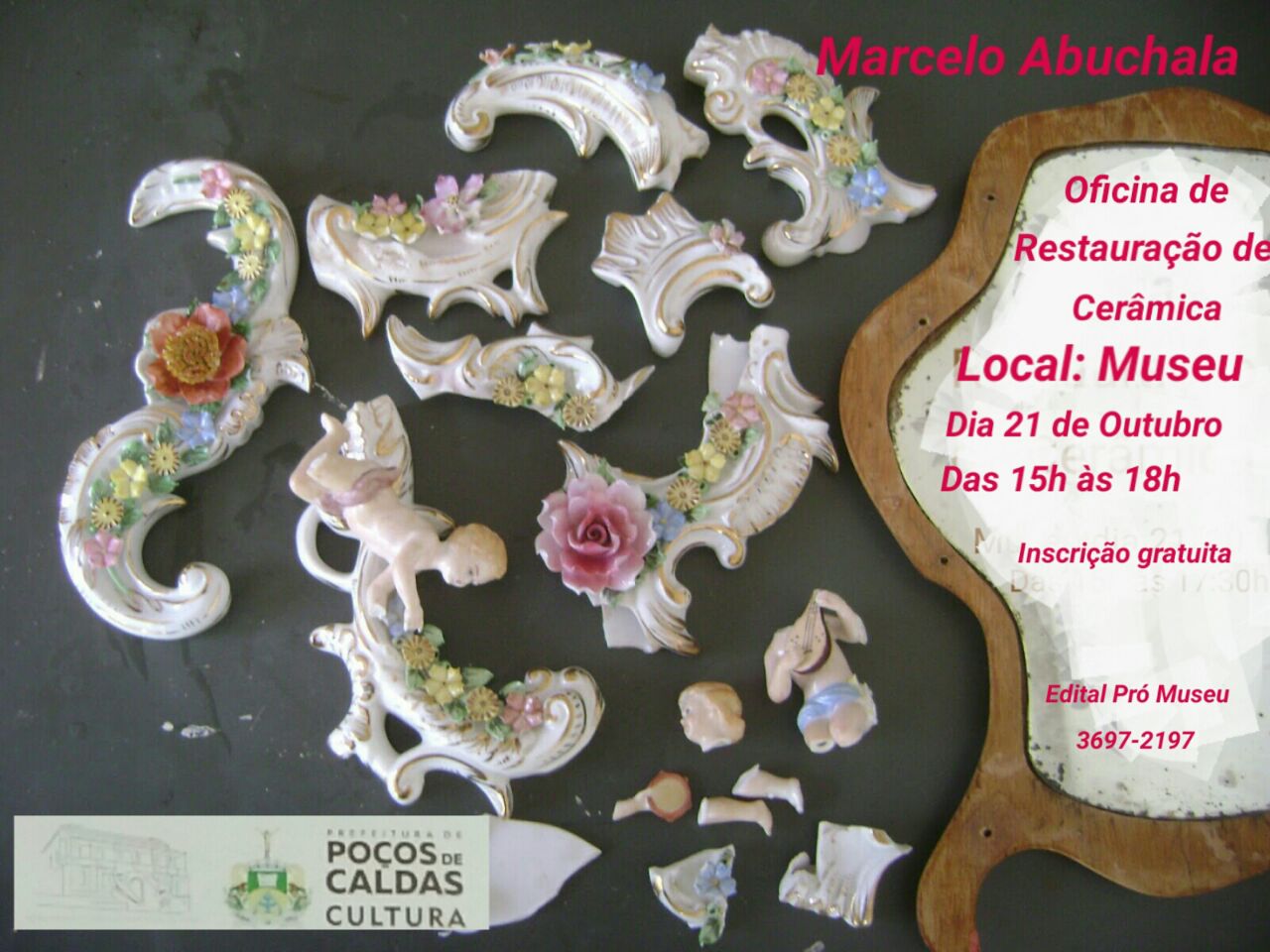 O Museu Histórico e Geográfico de Poços de Caldas promove, neste sábado (21), das 15h às 18h, oficina de Restauração de Cerâmica, com orientação do artista plástico, Marcelo Abuchalla. Por se tratar de uma atividade delicada e sensível, a aula é dirigida à pessoa com alguma habilidade manual e um pouco de conhecimento prático de materiais e técnicas. Inscrições gratuitas.