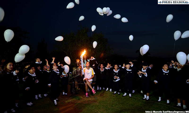 Sob gritos de “tocha, tocha, tocha”, crianças itabiranas receberam o revezamento na terra natal de Carlos Drummond de Andrade nesta quinta-feira (12/5)