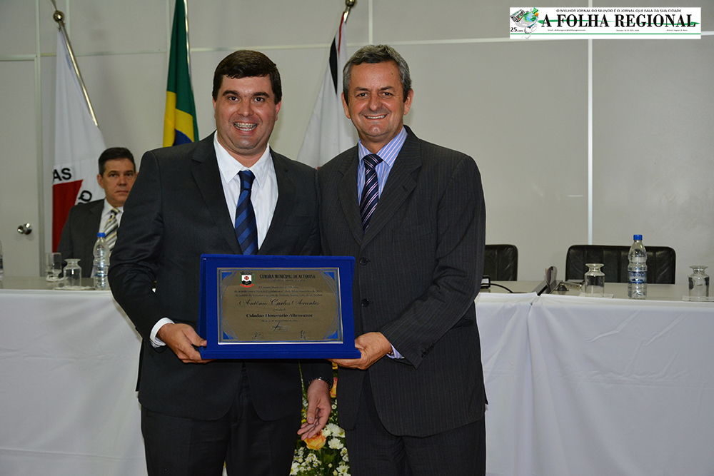 O deputado estadual Antônio Carlos Arantes recebeu na noite de sexta-feira (11.12.15) o título de cidadão honorário de Alterosa. A preposição foi do presidente da Câmara, Eugênio de Andrade Souza e aprovada por unanimidade pelos demais vereadores.