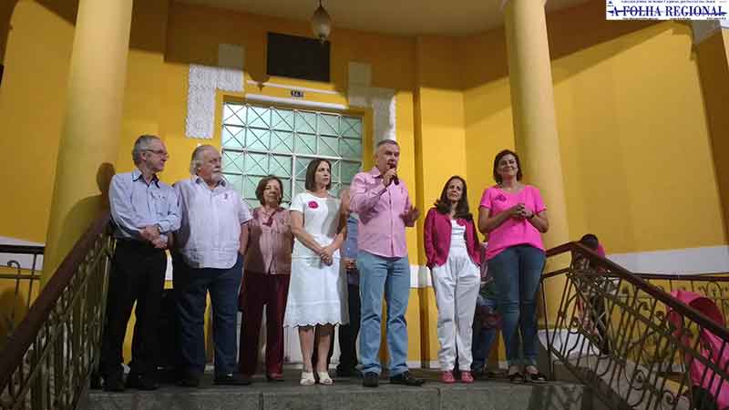Autoridades, servidores públicos municipais e a população em geral participaram da abetura oficial do Outubro Rosa na escadaria da Prefeitura, no início da noite de domingo (1º).
