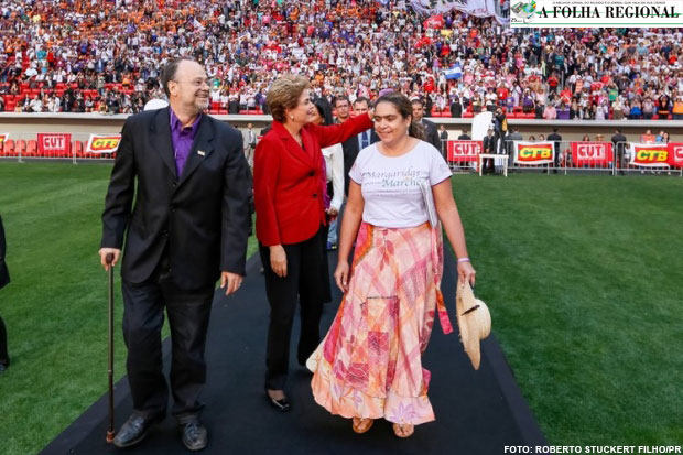 A presidente foi recebida pela plateia aos gritos de "Não vai ter golpe" e "Olê olê olá, Dilma" e fez o discurso no centro de uma gigante margarida, instalada no campo do estádio Mané Garrincha.