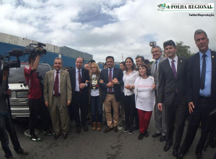 A comitiva, composta pelos senadores Aécio Neves (PSDB), Aloizio Nunes (PSDB), Cássio Cunha Lima (PSDB), Ronaldo Caiado (DEM), Agripino Maia (DEM) e Sérgio Petecão (PSD), é acompanhada por batedores da Polícia Militar da Venezuela.