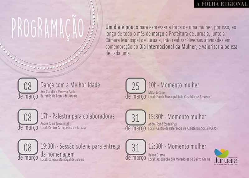 A Prefeitura municipal de Juruaia, por meio da Secretaria de Saúde, Educação e Desenvolvimento Social, inicia nesta quarta-feira (8) as atividades do Mês da Mulher.