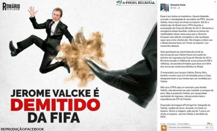 O senador Romário (PSB-RJ) comemorou na quinta-feira (17) o afastamento de Jérôme Valcke do cargo de secretário-geral da Fifa.