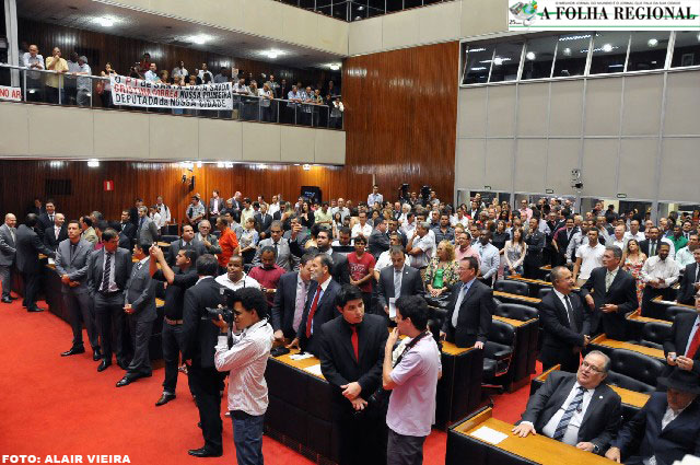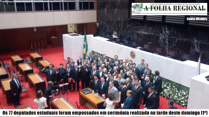 Tomaram posse no início da tarde deste domingo os 77 deputados estaduais que irão compor a 18ª legislatura da Assembleia Legislativa de MInas Gerais. A cerimônia foi realizada no plenário da casa. foi realizada, também a eleição da nova Mesa Diretora. Setenta e seis dos 77 deputados estaduais aprovaram Adalclever Lopes (PMDB) como o novo presidente da casa, após um pequeno tumulto sobre como deveria ser a eleição.