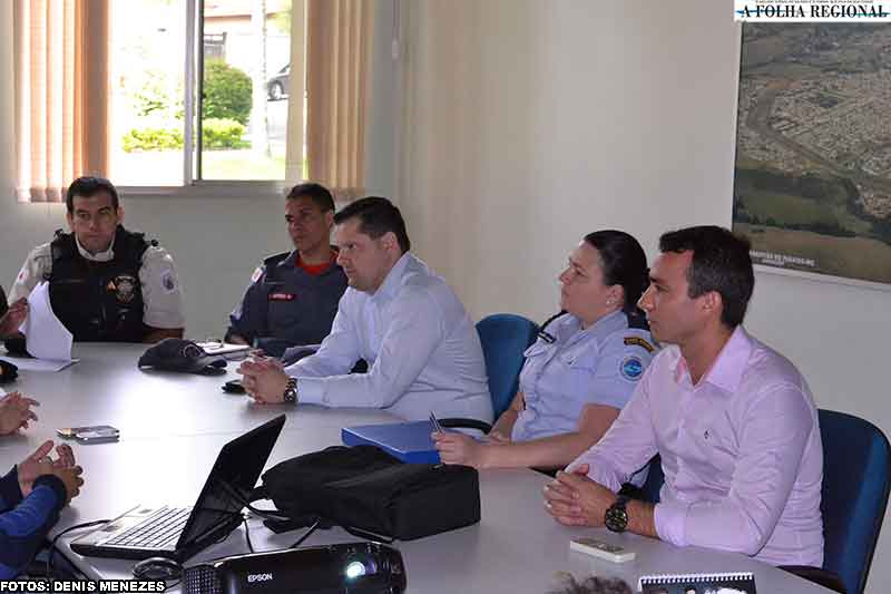 Representantes das polícias Civil, Militar, Corpo de Bombeiros, Tiro de Guerra e Unidade Prisional estiveram reunidos na sexta-feira, 2 de dezembro, com o secretário municipal de Segurança Pública, Trânsito, Transporte e Defesa Civil, Miguel Félix de Souza, e a gerente administrativa, Maria Cândida Torrano Freitas de Campos.