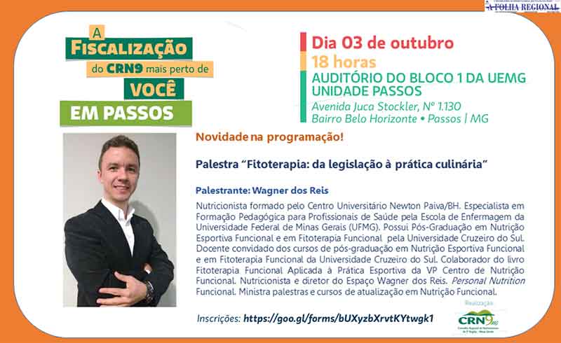 O Conselho Regional de Nutricionistas promove nesta terça (03/10), as 18h, evento de atualização de profissionais no município de Passos e na UEMG.