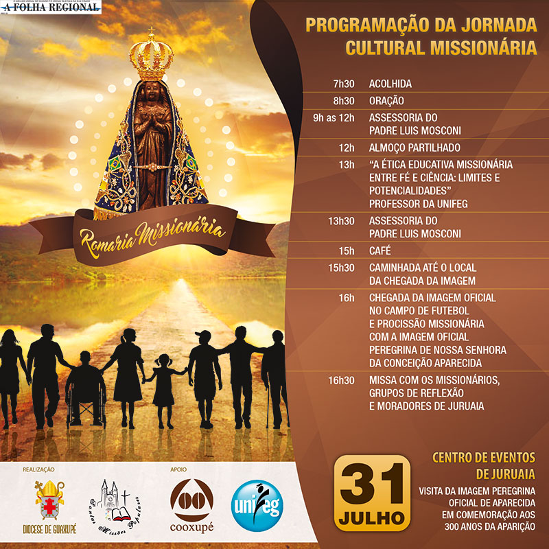 Num clima festivo e de muita devoção, a imagem de Nossa Senhora Aparecida trazida do Santuário Nacional na terça-feira (26), saiu em carreata acompanhada pelo Corpo de Bombeiros da Praça da Igreja Matriz, às 15 horas deste domingo (31) até o Centro de Eventos em Juruaia. Conduzida pelo bispo diocesano, dom José Lanza, e com a presença de alguns padres e muitos fiéis, a imagem chegou depois em um ambiente festivo e de muita fé.