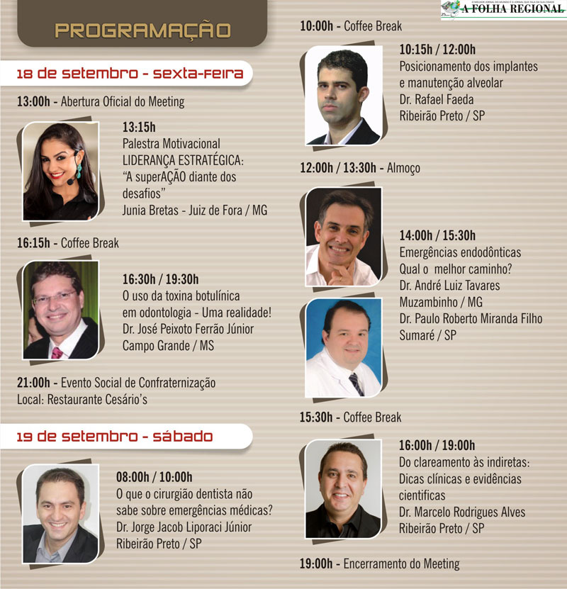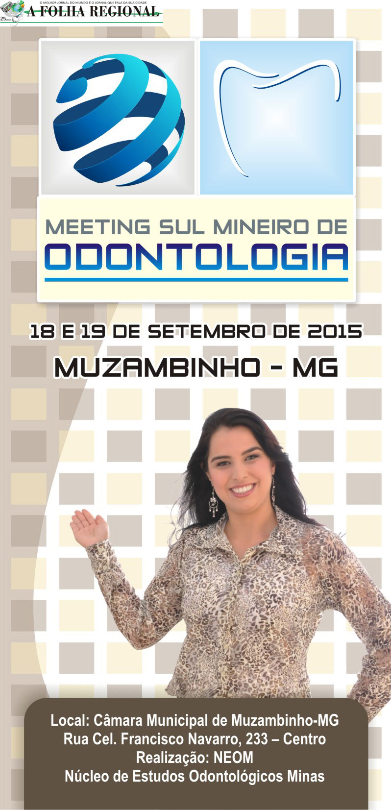 Oportunidade imperdível para aqueles que buscam atualização e crescimento na profissão. Evento é inédito na região Nos dias 18 e 19 de setembro (Sexta-feira e sábado), Muzambinho-MG sediará o I Meeting Sul Mineiro de Odontologia. Para o evento estão confirmados nomes de destaque na Odontologia Nacional (Ver programação abaixo) com temas bem variados, adequados para aqueles que têm interesse em se manter atualizados.