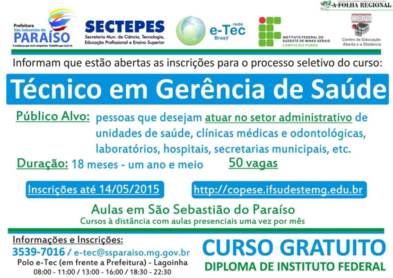 A Secretaria Municipal de Ciência, Tecnologia, Educação Profissional e Ensino Superior da Prefeitura de São Sebastião do Paraíso está com inscrições abertas até o dia 14 de maio, para o processo seletivo do curso Técnico em Gerência de Saúde. São ofertadas 50 vagas, sendo que que as aulas à distância ocorrerão no período de 18 meses com um encontro presencial ao mês. O curso é gratuito e ao final é concedido diploma do Instituto Federal.