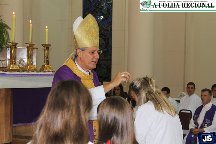 O bispo Dom Lanza realiza a Imposição de Cinzas numa das milhares de fieis presentes à Igreja. Fieis de diferentes áreas da cidade participaram, na noite de quarta-feira, 18 de fevereiro, da “Missa de Cinzas” e abertura da Campanha da Fraternidade 2015. A celebração, ocorrida na Igreja Nossa Senhora das Dores, em Guaxupé, denotou a fé do povo na vida espiritual.