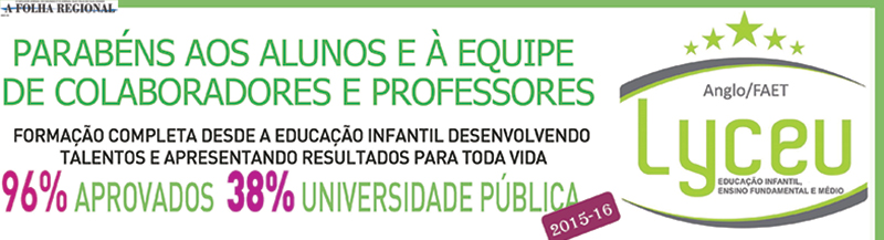 O Colégio Lyceu/FAET, sistema Anglo de ensino, oferece formação completa, desde a educação infantil, ensino fundamental e médio, desenvolvendo talentos e apresentando resultados para toda a vida.