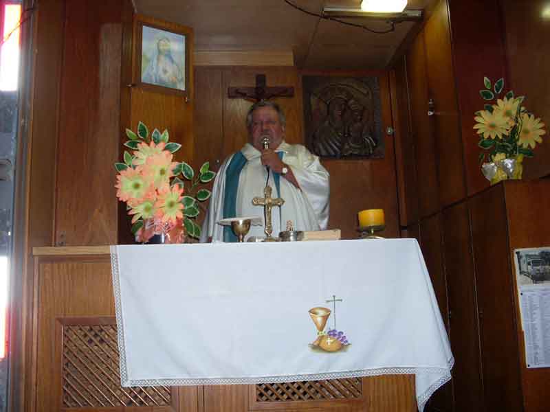 Para agilizar os trabalhos, cada uma das equipes conta com um caminhão Volkswagem 8.150, com baú ¾, onde é montada uma capela “ambulante”, com sistema de iluminação e som próprio, além de um compartimento que serve de aposento do padre para os pernoites.