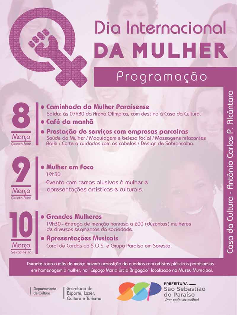 A Prefeitura de São Sebastião do Paraíso, através da Secretaria Municipal de Esporte, Lazer, Cultura e Turismo, promoverá uma série de eventos relativos à comemoração do Dia Internacional da Mulher. Conforme Everaldo Barbosa, do departamento de Cultura, a intenção é realizar uma programação simples para que a data seja lembrada. "Teremos alguns eventos que vão marcar este momento de celebração em homenagem às mulheres que são personagens importantes em nossas vidas e que merecem toda a nossa atenção e carinho", destaca.