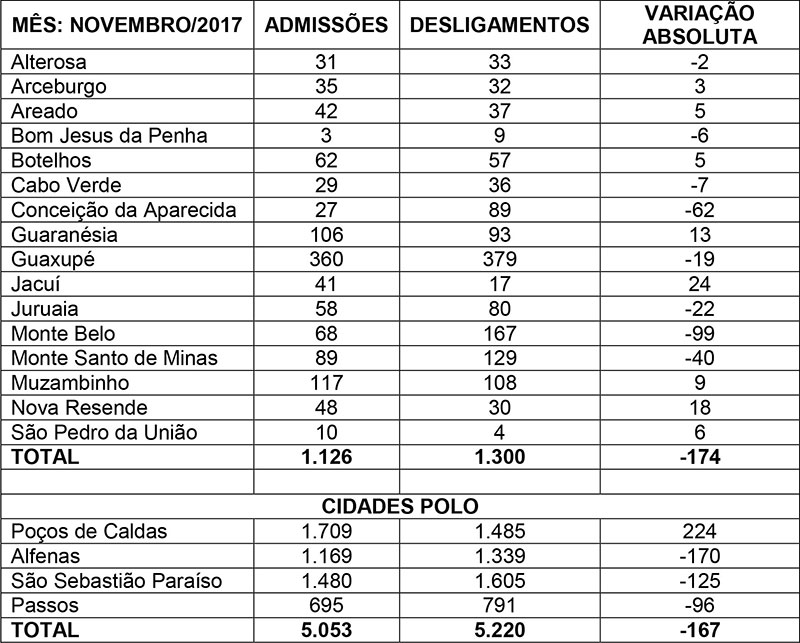 Conforme levantamento do Cadastro Geral de Empregados e Desempregos, a região perdeu empregos no mês de novembro. Na AMOG - Associação dos Municípios da Microrregião da Baixa Mogiana, a variação foi negativa em metade das cidades e positiva nas outras oito. Porém, os números negativos superam os positivos. Nem mesmo Juruaia, Capital Mineira da Lingerie e com grande movimento nos finais de ano, escapou da situação e teve 80 demissões e 58 contratações. No geral, a região teve 1.126 admissões e 1.300 desligamentos. Nas cidades polos de Poços de Caldas, Alfenas, São Sebastião do Paraíso e Passos, a variação também foi negativa. Agora é esperar os dados de dezembro para conferir se as compras de Natal compensaram um ano de muitas perdas.
