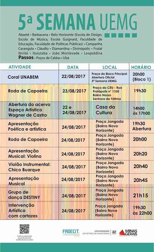 Durante os dias 22, 23 e 24 de agosto de 2017 acontece a 5ª SEMANA UEMG. O evento bienal é realizado na instituição desde 2011 e nesta edição tem como objetivo fomentar atividades de cunho artístico e cultural, reforçando os laços entre a Universidade e a comunidade local.