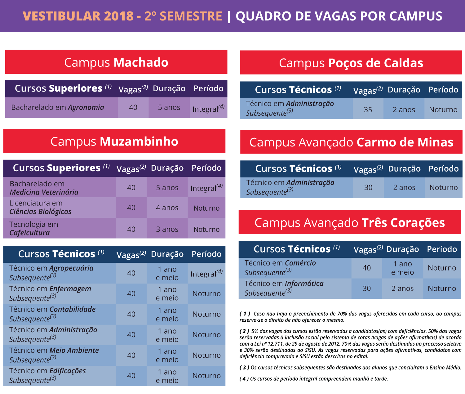 O Instituto Federal do Sul de Minas (IFSULDEMINAS) abriu nesta sexta-feira, dia 09 de março, as inscrições para o Vestibular do 2º semestre de 2018. Os editais que regulamentam o processo seletivo estão disponíveis no site portal.ifsuldeminas.edu.br. Ao todo, são oferecidas 375 vagas para cursos técnicos nos municípios de Carmo de Minas, Muzambinho, Poços de Caldas e Três Corações. Além de 112 vagas para graduações nos campi de Machado e Muzambinho. Todos os cursos ofertados neste processo seletivo são presenciais e gratuitos.