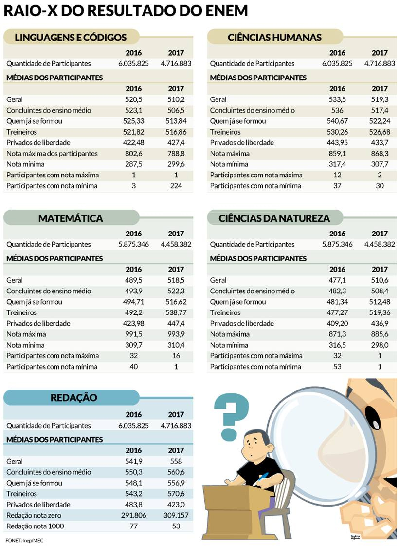 No segundo dia do Enem, quando 4,4 milhões de pessoas compareceram aos locais de prova, matemática daria bomba em 79,5% dos participantes com média inferior a 600 pontos. E o “bicho-papão” dos estudantes teve um salto e tanto, uma vez que a média geral passou de 489,5 pontos na edição de 2016 para 518,5 no ano passado. Já as matérias ligadas a biologia, química e física também não seriam complacentes, reprovando 87% de seus estudantes – um universo de 3,9 milhões de pessoas. Nessa área, também houve aumento da média geral: de 477,1 para 510,6. Com tantas deficiências, a redação não poderia ser diferente e também faria muitos alunos repetirem o ano: 70% ou pouco mais de 3 milhões. A média da escrita foi a maior de todas: 558 pontos.