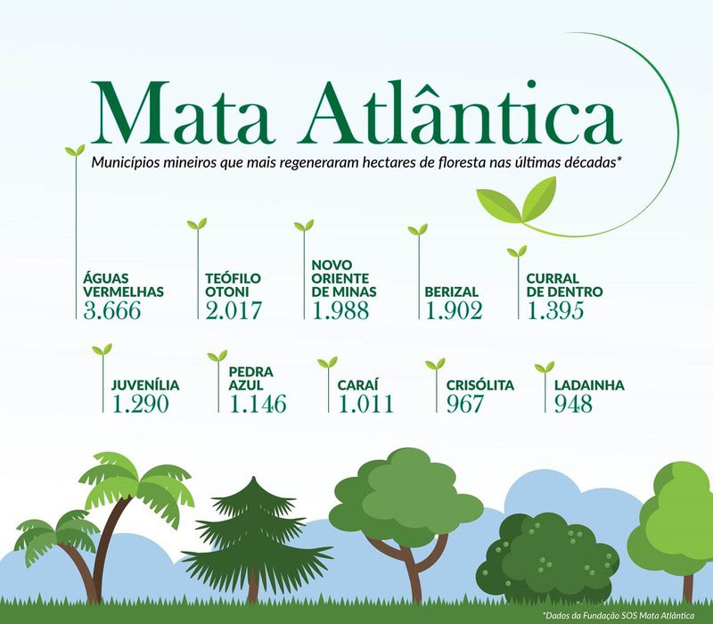Entre 1985 e 2015, ainda de acordo com dados da SOS Mata Atlântica, Minas Gerais foi o segundo estado com maior regeneração do bioma no país, com 59.850 hectares de Mata Atlântica recuperados. A cidade de Águas Vermelhas, no Vale do Jequitinhonha, é a que teve mais áreas regeneradas, com um total de 3.666 hectares, seguida por Teófilo Otoni (2.017 ha) e Novo Oriente de Minas (1.988 ha), ambas no Vale do Mucuri.