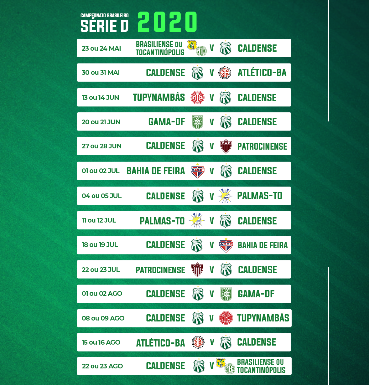 A estreia da Caldense será no dia 23 ou 24 de maio fora de casa contra o vencedor de Brasiliense-DF e Tocantinópolis-TO. Depois o Verdão recebe o Atlético de Alagoinhas-BA no Ronaldão em 30 ou 31 de maio. Veja a lista completa dos jogos do Verdão no arquivo em anexo.
