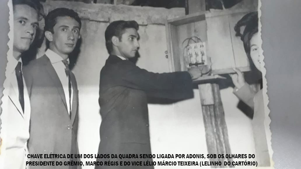 Repetindo, conforme o parágrafo anterior, que, sem que a TV tivesse chegado a Muzambinho, era o cinema nossa grande fonte de lazer e de cultura. Mas, era pago, nem todos podiam frequentá-lo quase todos os dias. Então, havia outro grande espaço de diversão que era a Quadra de Esportes do Colégio, no coração da Avenida Américo Luz, a mesma que ainda hoje sobrevive. Ali, não se praticava só a Educação Física da grade escolar, mas, eventos culturais ou esportivos, tipo o futsal, o handebol, o voleibol e até o basquetebol. Pois bem, desde 1962, Adônis Galileu dos Santos tinha sido eleito e reeleito, em eleições colegiais amplas e secretas, para o cargo de Orador do Grêmio SALCEM – Social, Artístico e Literário do Colégio Estadual de Muzambinho. Em meados do ano seguinte, o da nossa despedida como alunos do Colégio, fomos eleitos para um mandato que não se completaria, sob contrariedade do então Diretor, Prof. Reinaldo Benassi, justamente, porque iríamos concluir nossos cursos em definitivo no fim do ano. Comigo na Presidência do Grêmio, com outros companheiros, mas, sobretudo com o entusiasmo e o assíduo trabalho de Adônis junto à comunidade muzambinhense, construímos uma obra que o Estado de Minas Gerais foi incapaz de fazê-la: dotar a Quadra do Estadual com moderna iluminação, que fizesse jus à importância que ela então representava para o ensino, o esporte, à cultura e o lazer de Muzambinho. Com apoio da Prefeitura, de contribuições de cidadãos e do comércio local e de arrecadações com jogos e festas, concretizamos o nosso intento, inaugurando esse feito em novembro de 1963. Segundo o escritor Amir Álem Aquino, no seu livro Personalidades, Histórias de Vidas, Editora Legis Summa, 2010, pgs. 136/37 “A iluminação, ou melhor, a ‘escuridão’ anterior foi jogada ao chão; nem mesmo os postes antigos (de canos de ferro) foram utilizados. Tudo novo em folha. (((com a permissão do Amir vou fazer um adendo: com postes de cimento construídos pelos alunos e colocados em moldes de madeira no antigo almoxarifado da Prefeitura, onde hoje funciona o Supermercado São João, ex-Lojas Irmãos Santini de Materiais de Construção. Durante alguns dias, a fim de não trincarem, eles teriam que ser regados com água de manhã e à tardinha, quase sempre missão para Adônis e Marco Regis))).  E, assim, em aproximadamente cinco meses, a quadra passou a ter uma iluminação decente. Esta iluminação durou quase trinta anos, até o dia em que a quadra foi coberta e teve de ser substituída por outra que se adequasse ao formato da sua cobertura”.