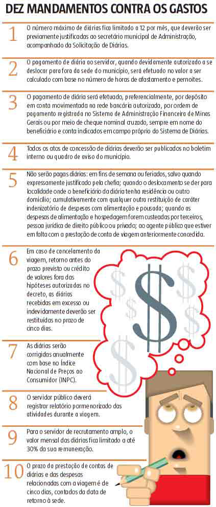 A farra das diárias nas regiões da área mineira da Sudene pode estar com os dias contados. Oitenta cidades ligadas à Amams, associação que representa os municípios da região, deverão assinar, até 15 de março, um termo de compromisso com o Ministério Público Estadual (MPE) para adotar regras únicas para a liberação de recursos para servidores em viagem. As normas serão adotadas por meio de decreto que estabelece que nenhum servidor poderá receber mais de 12 diárias mensalmente, condicionadas a pernoite fora do município ao qual prestam serviço. O termo exige também a apresentação de um relatório pormenorizado das atividades desenvolvidas durante a viagem. Além disso, o pagamento só ocorrerá com autorização do ordenador de despesas. A intenção é dar um basta a pagamentos indevidos, que, nos últimos quatro anos, podem ter desviado mais de R$ 1 milhão em apenas seis cidades investigadas pelo MPE na região, considerada a de menor Índice de Desenvolvimento Humano (IPH) de Minas Gerais.