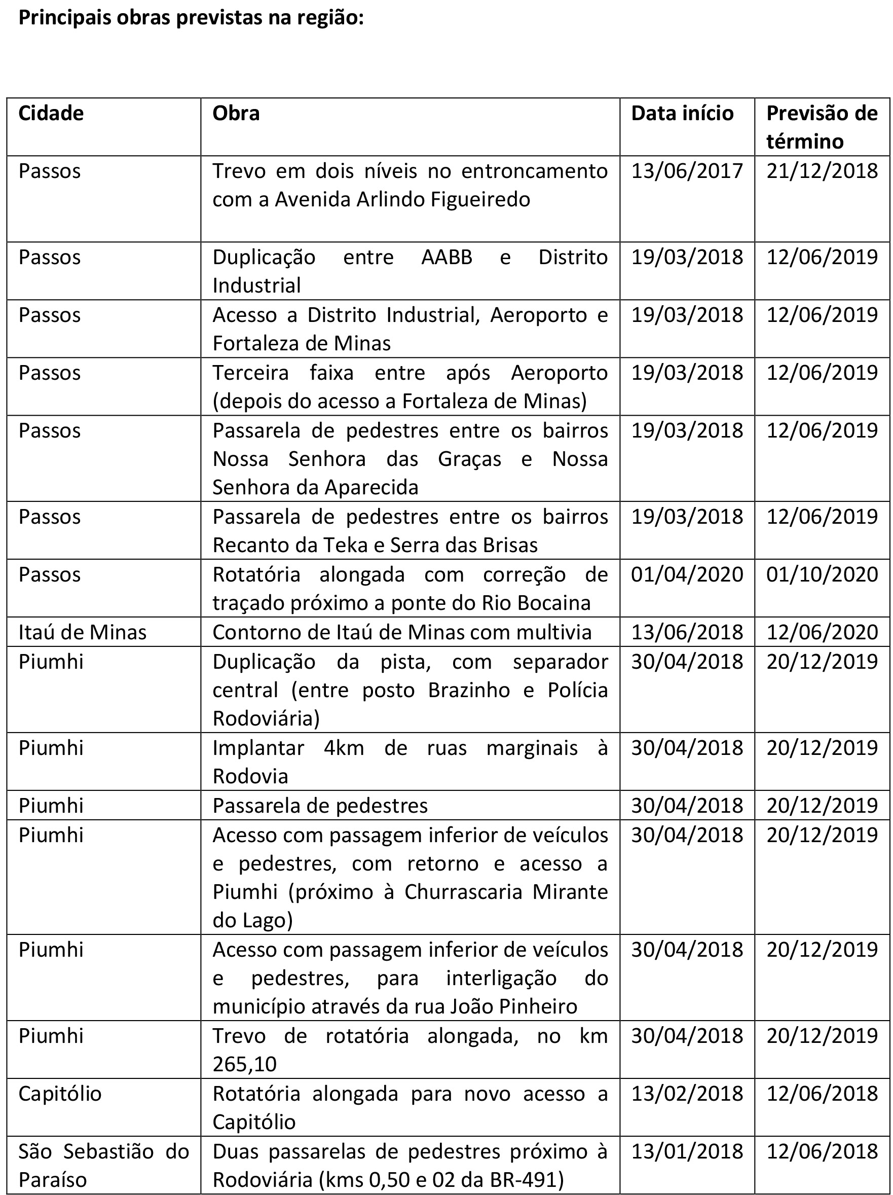 O novo termo ainda contempla duas passarelas de pedestres em Passos, melhorias no acesso a Fortaleza de Minas/Aeroporto/Distrito Industrial, duplicação do trecho entre a AABB e Distrito Industrial e ainda a alça de Itaú de Minas, passando a rodovia por fora da cidade. Para Piumhi, estão previstos neste novo cronograma a duplicação do trecho entre o posto Brazinho e a Polícia Rodoviária. “Essas obras não faziam parte do contrato e foi preciso discutir para ser inserido, com cronograma para início, contemplando muitas necessidades ao longo da rodovia”, explica o diretor-presidente da AB Concessões, José Renato Ricciardi.