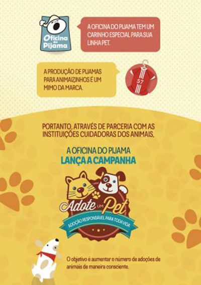 Com o apoio de instituições de proteção animal, a Oficina do Pijama lança a campanha “Adote um Pet – Adoção responsável por toda a vida”. “A ideia é simples mas feita de maneira a atender uma demanda por animais domésticos que precisam de um lar. Mas queremos, também, chamar a atenção para a doação consciente, pois não basta levar para casa um animal e não cuidar do seu bem-estar. Foram essas as premissas que levou a empresa a adotar essa ideia”, diz Ribeiro.