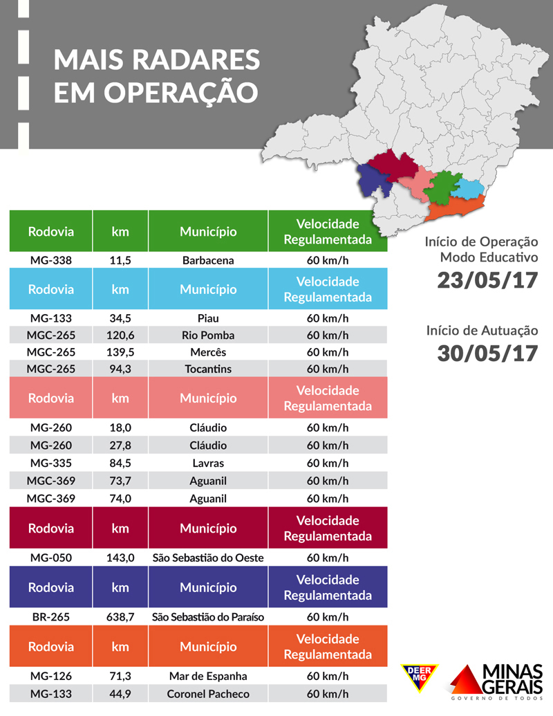 O DEER/MG reforça que em todas as rodovias, mesmo as que ainda não possuem radares em funcionamento, os motoristas devem obedecer à sinalização e às regras de trânsito, garantindo segurança nos deslocamentos.