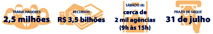 Além disso, está prevista a abertura antecipada (2 horas antes) de todas as agências da CAIXA no dia 10 de julho para pagamento exclusivo de contas inativas do FGTS. Nas regiões em que os bancos abrem às 9h, as agências da CAIXA abrirão às 8h e terão o horário de atendimento prorrogado em 1h.
