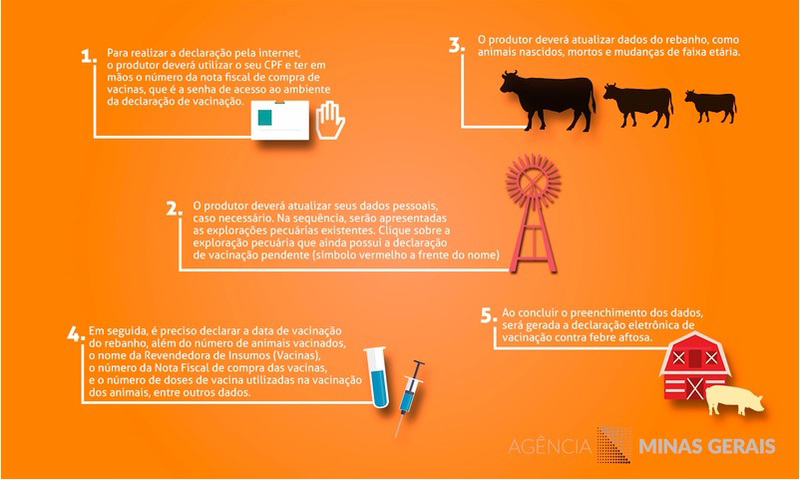 A vacinação de bovinos e bubalinos contra a febre aftosa é obrigatória em todo o território mineiro e deve ser realizada duas vezes por ano. A primeira etapa ocorre de 1º a 31 de maio, quando devem ser vacinados todos os bovinos e bubalinos, independentemente da idade. Além de vacinar, o produtor também deve declarar a vacinação até o dia 10 de junho.