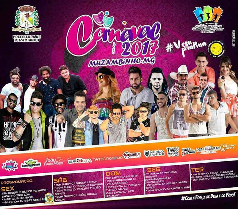 Vem prá rua! Este é o slogan do carnaval de rua da prefeitura de Muzambinho, entre 24 e 28 de fevereiro. Os detalhes da organização foram revelados à reportagem pelo Secretário Municipal de Cultura, Renato Rezende, que esteve acompanhado pela diretora de eventos Thaísa Salomão, além do prefeito Sérgio Esquilo.