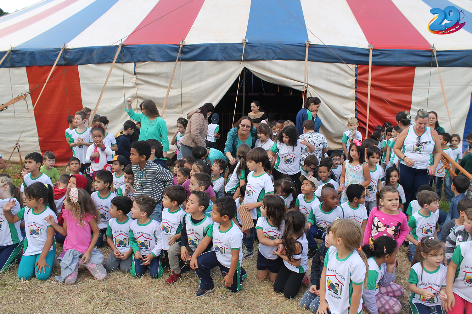 As crianças e professores que estiveram prestigiando as atividades e foram recebidos pelos artistas do circo Astros.