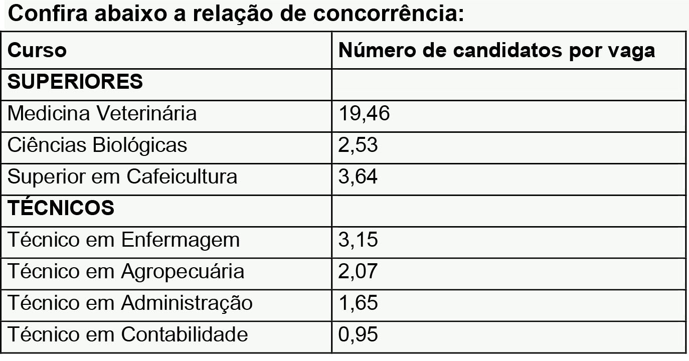 Foram ofertadas 84 vagas para cursos superiores sendo 28 vagas para o curso de Bacharelado em Medicina Veterinária (curso com duração de 5 anos), 28 vagas para a Licenciatura em Ciências Biológicas (curso com duração de 4 anos) e 28 vagas para o curso de Tecnologia em Cafeicultura (curso com duração de 3 anos).