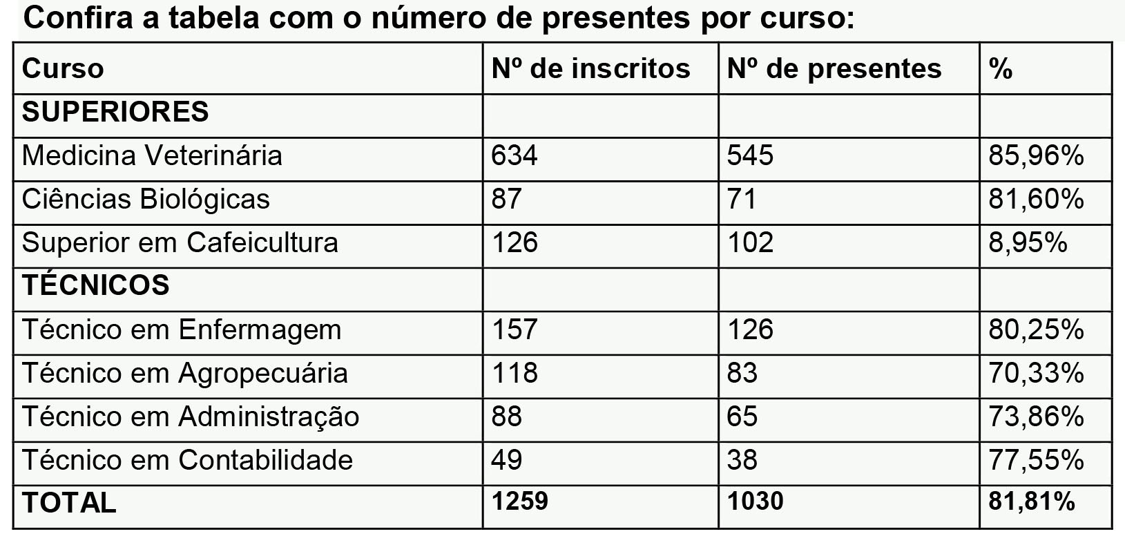 As provas foram realizadas na sede do Campus Muzambinho e na unidade José Januário de Magalhães, no período de 13h15 às 17h15, totalizando 4 horas de prova.