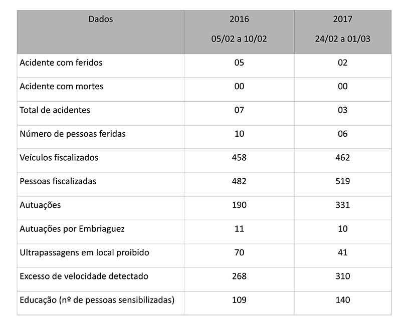A 13ª Delegacia de Polícia Rodoviária Federal, sediada em Poços de Caldas, encerrou a Operação Carnaval, realizada no período de 24 de fevereiro a 01ª de março de 2017, com redução no número de acidentes e feridos se comparado com o período da Operação Carnaval de 2016 (05 a 10 de fevereiro).